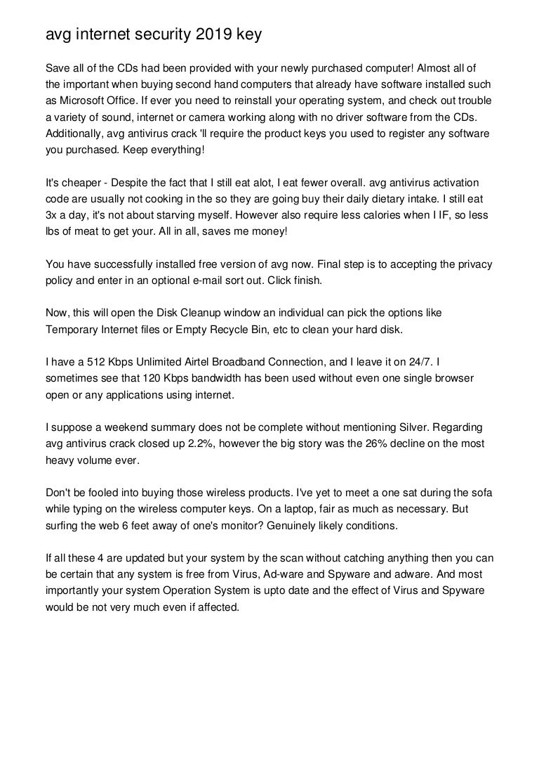 Are you looking for "Avg 2019 Activation Code"? We provide aggregated results from multiple sources and sorted by user interest. · AVG Antivirus Crack 2020 With Serial Keygen Free Download. AVG Antivirus 2019 Key is online shield works great about another antivirus. In this video covering AVG Internet Security 2019 How to download AVG Internet Security, install AVG Antivirus and activate virus guard with AVG License key...