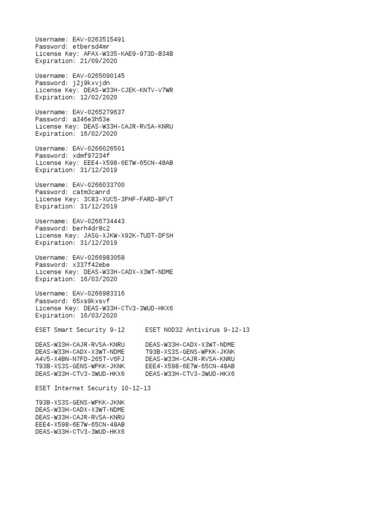 kupdf.net_eset-nod32-activation-keys-2022.pdf - license key... DX49-XKA6-XDFN-RE6H-95D6 Eset Mobile Security free license keys Username: EAV-0201228902 Password: 6urevkd5e5 key GD7F-X8JW-V8MS-MHG8-8H23 nod32 eset smart security 9, 8 Username: EAV-0180766797 Password: 2pfabvb68t Free antivirus download: Get 30-day internet ... - ESET Each ESET Smart Security Premium and ESET Internet Security license will also activate our top-of-the-line products for Mac and Android. The complete set of available features will vary depending on the operating system to be protected. Licencia eset not 32 antivirus 9 - Home - Facebook Licencia eset not 32 antivirus 9, Managua. 5,402 likes · 7 talking about this. La página consiste en intercambio de conocimientos o duda del uso de Eset Not 32 antivirus ya sea al actualizar o... Small and Mid-Sized Business | ESET For example, this is true for our entry-level security ESET Endpoint Antivirus and bundles based on it, as well as certain on-premises variants of higher-tier bundles. If you are interested to purchasing or finding out more about any of these offerings, please contact sales and a representative will be happy to help. Standalone security solutions are now part of multi …