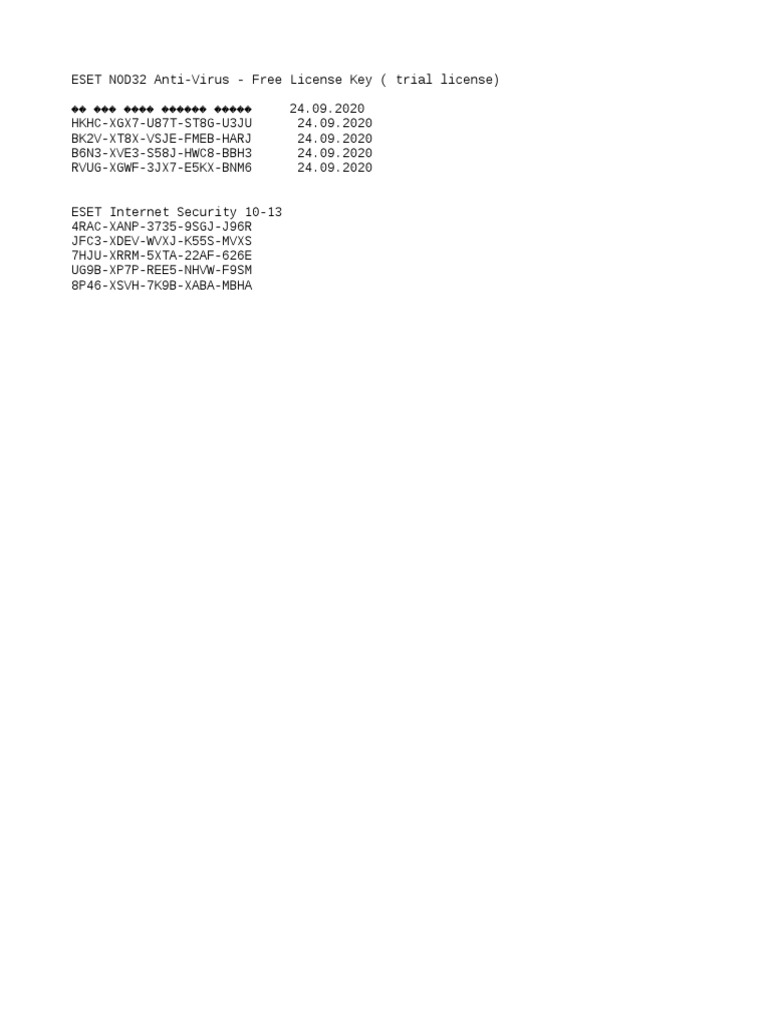 Download award-winning security products | ESET Download a free 30-day trial Up to 6 months of free trial for referring your friends Recommend ESET to friends or family via the "Refer your friend" button in your application. For every successful referral, we reward you and each person who installs ESET Security with one more month of free trial. ESET Smart Security Premium for 30 days License key: GVKU-XNVR-AT2E-WJRT-8K8K Expiration date: 19/01/22 ========= ESET NOD32 Antivirus for 30 days License Key: W69D-X6GA-XUTF-NEFW-BGXB Username (login): TRIAL- (030) 604-1790 Password: j73hhm3v7d License validity period: until 19/01/22. Dec 20, 10:31. 1. 0. Enter your name and email address to activate your ESET NOD32 Antivirus trial version. The trial can only be activated once. Select your country from the Country drop-down menu to register ESET NOD32 Antivirus with your local distributor, who will provide technical support.. Enter a valid email address into the Email address field. After activation, your Username and Password required for ... IF KEY IS TAKEN IT WORK WORK TO ANOTHER DEVICE. BE FAST! See more. Free Eset nod32 license key Here's Free Eset Nod32 Eset nod32 license key for 2020 2021 2022 Eset nod32 Username Password: Username : TRIAL-0260544543 Password : k2ns9r74np - Valid until August 04, 2021 Username : TRIAL-0260528744 Password : wonderchasers.com.