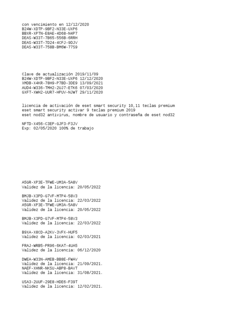 Licencia de eset nod32 antivirus 12. ESET Nod32 Claves, Licencias y Seriales Actualizada 2020-2022 Webestas son las claves de licencia para eset nod32 antivirus versión 12.2.30. rkug-xg9c-xteb-b8tv-wt7p. d7ta-xjpv-ppdv-4cth-h9vx. ap9r-x782-v2gg-vvjh-xt2f. 5jx6-xgja-wc52-8gnd-efj8. n9cr-xa6a-9wxv-6tnv-fagn. 7rmm-xuwj-bsec-a49d-fsx5. m4r4-x4gf-4bnc-mmp6-5rts. 9ma9-x7k3-mcjr-8buj-tdtw. 9tkh-xmd5-9bgp-fxna-kd3c. ee2k-xd4p-ea57-hb57-sx53. 3rsh … Antivirus Eset Nod32 Licence Key Till 2022 Working 100 - Yüzde … Web19/12/2022 · 2 gün önce · Licencia eset nod32 antivirus 13 2 18 0 hasta 2022 eset. licencias eset nod32 junio 2021 gratis eset internet security license key latest 2021 otosection. a veces igual podrás encontrar alguna licencia eset nod21 antivirus para todo el año 2021. claves de licencia para eset nod32 antivirus 8,9,10,11,12,13 y 14 … eset internet security license key 2023 WebEset Nod32 Internet Security 15, 14 Serial Keys 2022-2023-2024. 3,192 ecebnayişî · 33 teni derheqê ni de qesey u qali kenê.Eset Nod32 Internet Security 14-15 license key free 2022-2023-2024 and Eset.Update. 0 [C] ESET Smart Security Jan 16, 2022 · ESET Internet Security app for Windows 10 – Learn how to download and install the ESET Internet … Soluciones antivirus y seguridad en Internet | ESET Antivirus y soluciones de seguridad para tus dispositivos domésticos y corporativos. ESET para plataformas Windows, Android, Mac o Linux OS.